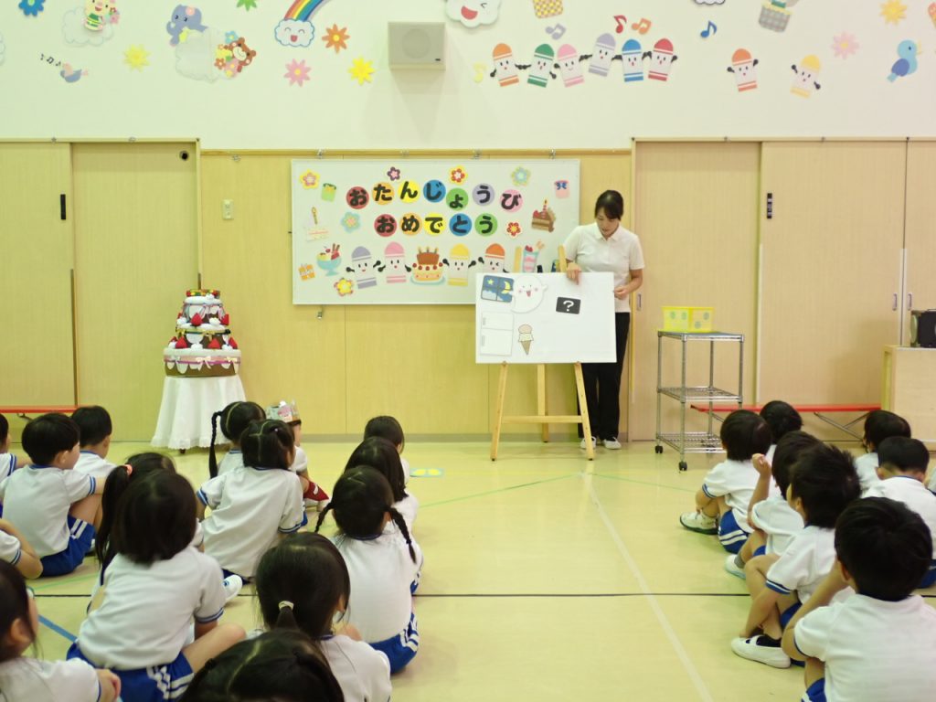 本日、10月生まれのお友だちの誕生会を行いました。 みんなでハッピーバースデーの歌のあと、先生からの出し物「くいしんぼうおばけ」のパネルシアターでは、夜中に現れたお化けが冷蔵庫の中からどんな食べ物を見つけたのか、みんなでワクワクしながら見ていました。年少さんが「まっかな秋」の歌のプレゼントをしてくれました。🎁とてもかわいい素敵な歌声でしたね🎵 先生たちと「いっぴきおばけ」の手遊びをしました。みんなでオバケのポーズをして楽しく過ごしました。